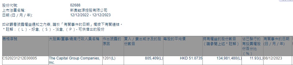 Inc.减持新奥能源(02688)80.5409万股,每股作价51.0735港元,总金额约为4113.51万港元。减持后最新持股数目约为1.35亿股,最新持股比例为11.93%。