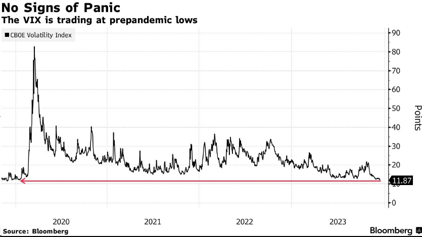 华尔街的恐慌指标——芝加哥期权交易所波动率指数(VIX)最近一直处于低迷状态,低于13,接近疫情前的低点。“虽然VIX指数显示走势平稳,但我们预计未来市场将更加动荡,”Harvey表示。