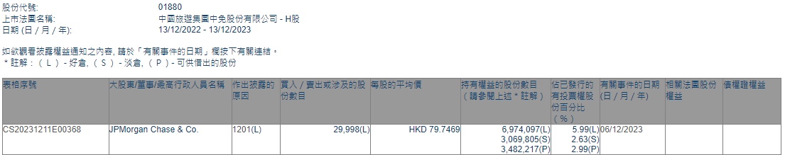 智通财经APP获悉,香港联交所最新资料显示,12月6日,小摩减持中国中免(01880)2.9998万股,每股作价79.7469港元,总金额约为239.22万港元。减持后最新持股数目约为697.41万股,最新持股比例为5.99%。