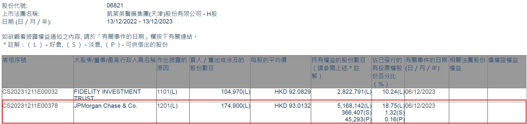 智通财经APP获悉,香港联交所最新资料显示,12月6日,小摩减持凯莱英(06821)17.49万股,每股作价93.0132港元,总金额约1626.8万港元。减持后最新持股数目约为516.81万股,最新持股比例为18.75%。