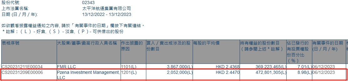 智通财经APP获悉,香港联交所最新资料显示,12月6日,Pzena Investment Management减持太平洋航运集团(02343)205.2万股,每股作价2.4470港元,总金额约为502.12万港元。减持后最新持股数目约为4.73亿股,最新持股比例为8.98%。