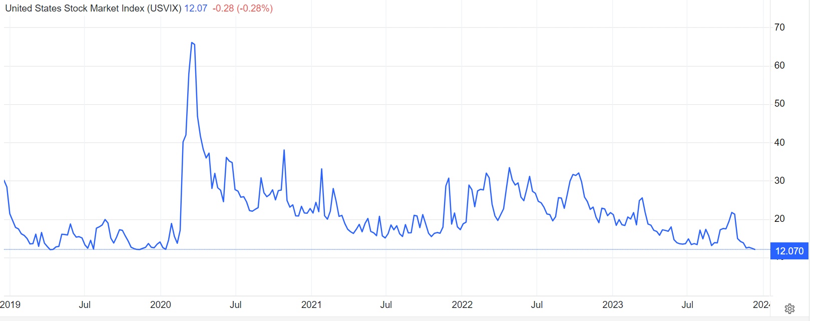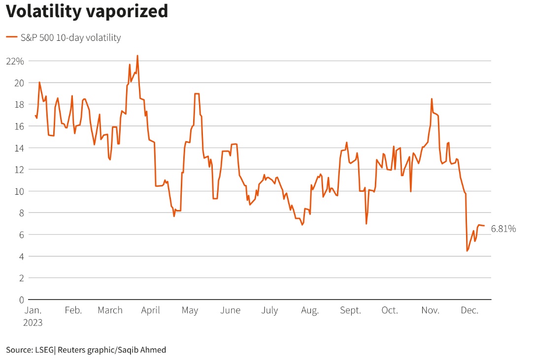 这种波动率平静趋势很有可能将延续到美东时间周三的美联储利率决议出炉。尽管市场普遍预期美联储将维持利率不变,但投资者仍渴望获得决策者是否将更早开启降息周期的暗示措辞,这一预期可谓大幅推动本季度美股大反弹。利率期货交易员们押注美联储将在2024年将基准利率下调逾一个百分点,并且市场押注第一次降息将从明年3月开始,但在高盛等华尔街大行看来这一预期过于激进。