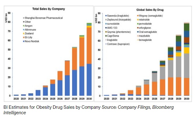 尽管诺和诺德和礼来作为先行者占据了肥胖市场的最大份额,但留给后来者(如Zealand)的剩余份额也值得重视。Bloomberg Intelligence的Michael Shah估计,到下一个十年,减肥市场可能会增长32倍,达到800亿美元。