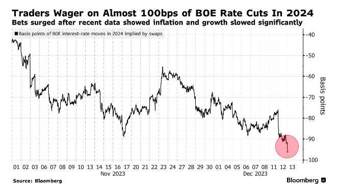 最新的定价变化使市场对英国央行的预期更接近美联储,交易员目前预计美联储明年将降息至少100个基点。美联储将于北京时间周四凌晨公布今年最后一次政策决定,英国央行将于周四晚间公布。