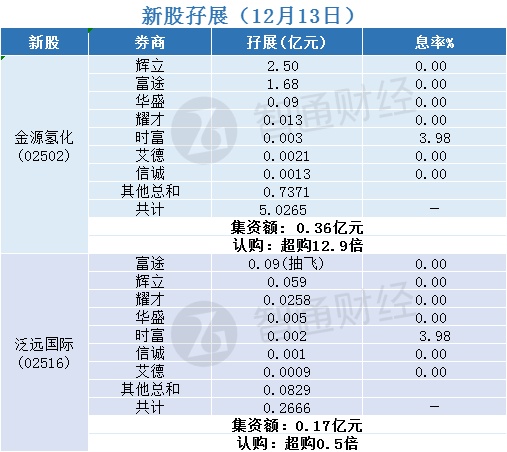 智通财经APP获悉,金源氢化(02502)、泛远国际(02516)正在招股中。截至12月13日,富途、辉立等券商合计为金源氢化借出孖展5.0265亿港元,超购逾12.9倍;合计为泛远国际借出孖展0.2666亿港元,超购逾0.5倍。