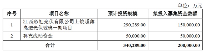 本次公开发行股票的实际募集资金扣除发行费用后,将用于江西彩虹光伏有限公司上饶超薄高透光伏玻璃一期项目和补充流动资金,具体情况如下表所示: