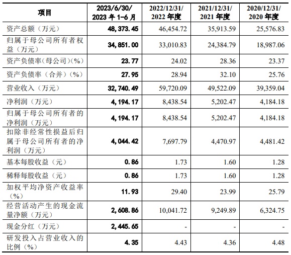 财务方面,2020年度、2021年度、2022年度、2023年6月30日止,公司实现营业收入分别为3.94亿元、4.95亿元、5.97亿元、3.27亿元,同期,公司实现净利润分别为4184.18万元、5202.47万元、8438.54万元、4194.17万元。