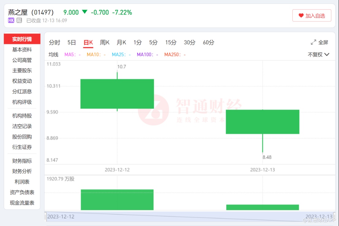 行情显示,燕之屋股价在12月12日以10.5港元开盘后冲高至10.7港元,较发行价最高上涨10.3%。随后“镰刀”漏出了“獠牙”,股价遭遇快速“砸盘”,12日盘中一度转跌。12月13日,燕之屋股价低开低走盘中一度下跌逾12%。