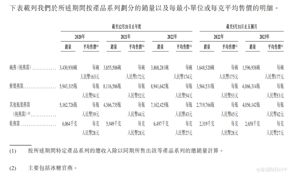 燕之屋通过打造高端牌可以规避同质化竞争,与此同时还有利于公司产品抢占有利的“价格空位”。招股书显示,燕之屋“碗燕”产品每碗的平均销售价格从2020年的163元/碗,提升至2023年前5个月的177元每碗。2022年,碗燕产品系列有54个纯燕窝SKU在售,2022年碗燕系列的纯燕窝产品的标准价格介于每碗198元至598元。
