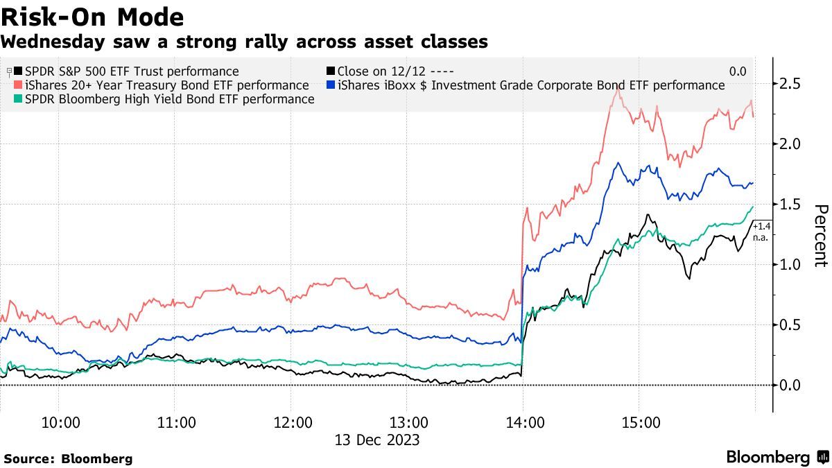 美联储意外放鸽引发了近年来最大的市场全面反弹之一:美股周三大幅上涨,道指收涨1.40%,报37090.24点并创下历史新高;纳指涨1.38%,标普500指数涨1.37%。COMEX 2月黄金期货涨2.5%,报2043.1美元/盎司。此外,美债收益率全线走低,其中,2年期美债收益率跌30.6个基点报4.433%,10年期美债收益率跌18.4个基点报4.021%。美元指数跌0.83%报102.95,非美货币普遍上涨。追踪投资级公司债、垃圾债和大宗商品的ETF也出现上涨。