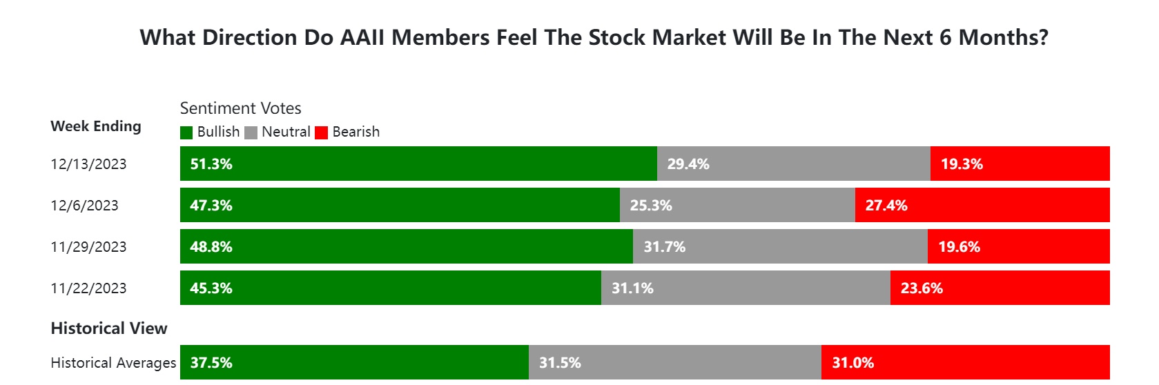 截至12月13日,AAII最新调查数据显示,备受关注的美股散户股市看涨信心指数迅速上升至50%以上,看涨未来6个月左右美股走势的散户投资者比例较11月中期激增,且看涨比例远远高于历史平均数据。