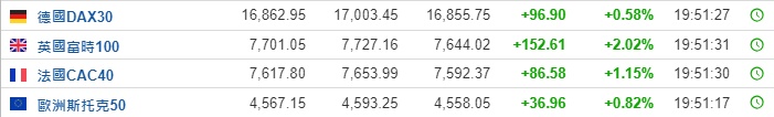 2. 截至发稿,德国DAX指数涨0.58%,英国富时100指数涨2.02%,法国CAC40指数涨1.15%,欧洲斯托克50指数涨0.82%。