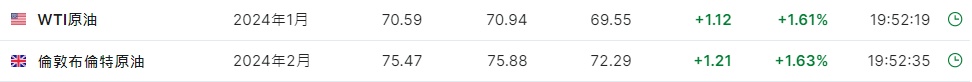 3. 截至发稿,WTI原油涨1.61%,报70.59元/桶。布伦特原油涨1.63%,报75.47美元/桶。