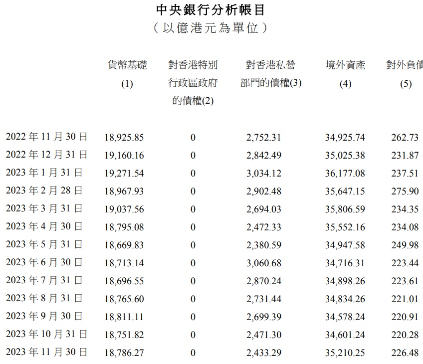 智通财经APP获悉,12月14日,香港金融管理局公布外汇基金在2023年11月底的主要分析帐目。11月份,外汇基金的境外资产增加609亿港元,至35210亿港元。货币基础为18786亿港元,包括负债证明书、政府发行的流通纸币及硬币、银行体系结馀,以及已发行外汇基金票据及债券。外汇基金对香港私营部门的债权总额为2433亿港元。对外负债总额为226亿港元。
