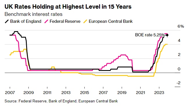 智通财经APP获悉,英国央行将利率维持在15年来的最高水平。不过,尽管市场对2024年降息押注不断增加,但政策制定者仍坚持传递利率在更长时间内保持在较高水平(higher