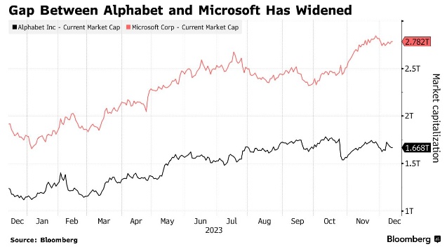 第三季度财报季似乎突显了人们对Alphabet地位的担忧,微软吹嘘人工智能对Azure增长的影响越来越大,而谷歌云的业绩令人失望。在股市上,两家公司之间的差距已经扩大,微软今年创下了一系列纪录。Alphabet仍比2021年的历史高点低12%左右。