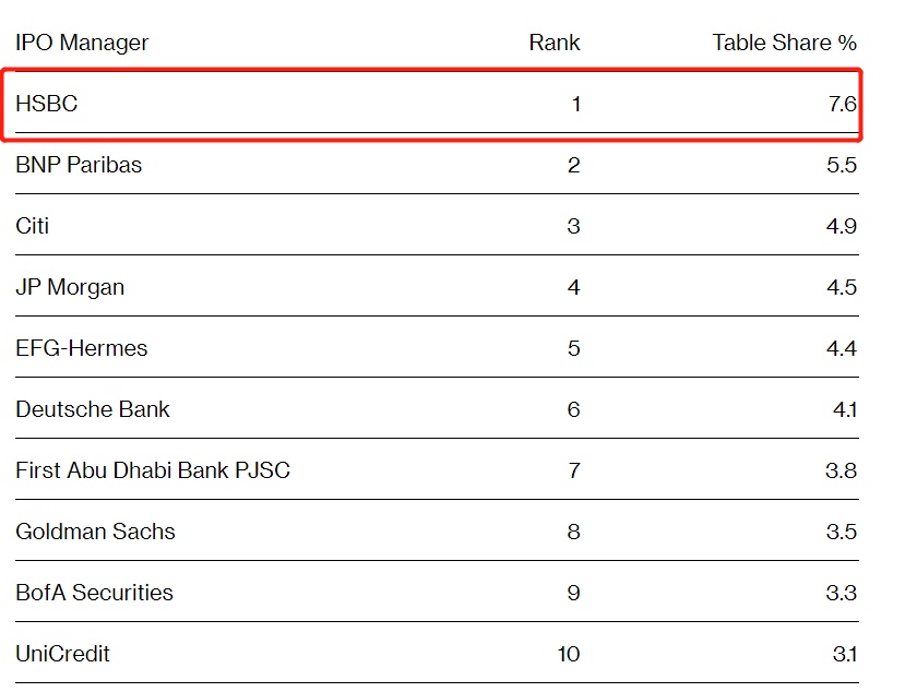 智通财经APP获悉,汇丰(HSBC Holdings Plc)经常被媒体调侃为中东地区的一家本地银行,这一印象今年似乎派上大用场,因为该地区的首次公开发行(IPO)活动远远超过其总部所在的欧洲市场。根据机构编制的排行榜数据,这家总部位于英国的大型商业银行连续两年在欧洲、中东和非洲地区(EMEA地区)的IPO业务规模中排名第一,其整体市场份额自2021年以来翻了一番多。
