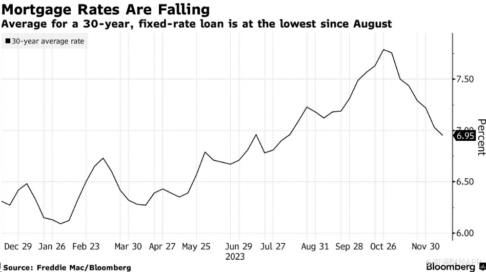 智通财经APP获悉,抵押贷款利率四个月来首次降至7%以下,给饱受负担能力问题困扰的美国房地产市场带来了一些缓解。房地美周四在一份声明中表示,美国30年期固定贷款的平均利率为6.95%,低于上周的7.03%。