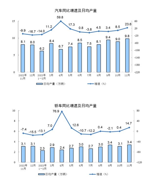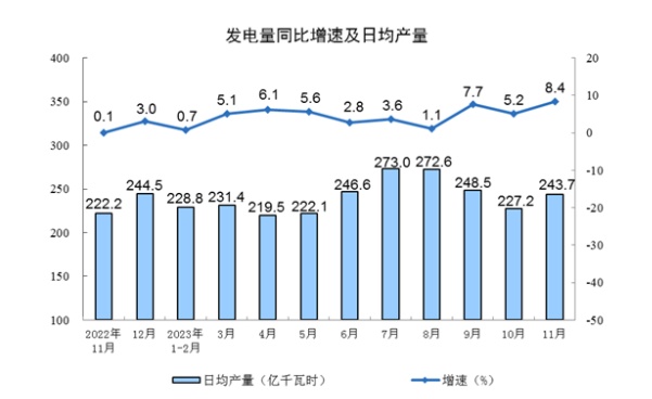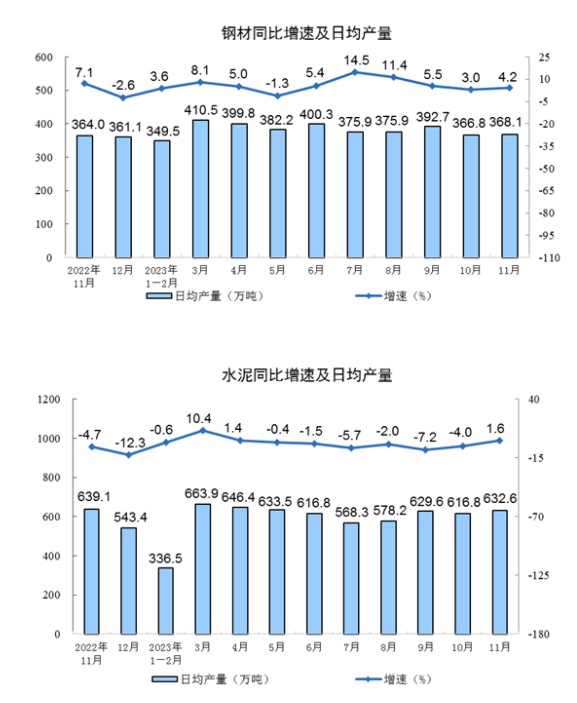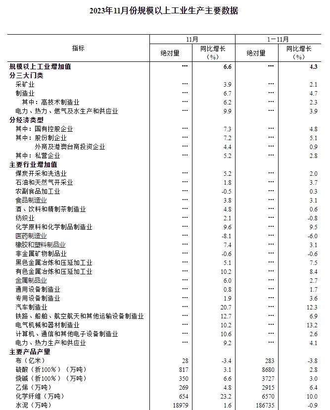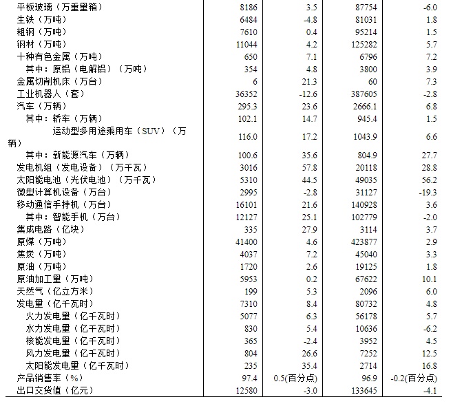 分产品看,11月份,620种产品中有367种产品产量同比增长。其中,钢材11044万吨,同比增长4.2%;水泥18979万吨,增长1.6%;十种有色金属650万吨,增长7.1%;乙烯269万吨,增长4.8%;汽车295.3万辆,增长23.6%,其中新能源汽车100.6万辆,增长35.6%;发电量7310亿千瓦时,增长8.4%;原油加工量5953万吨,增长0.2%。