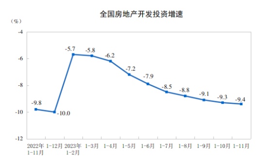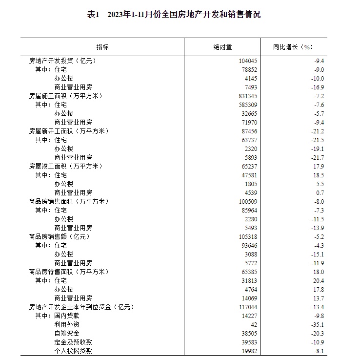 1—11月份,全国房地产开发投资104045亿元,同比下降9.4%(按可比口径计算);其中,住宅投资78852亿元,下降9.0%。