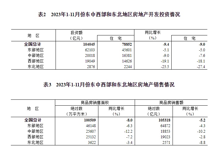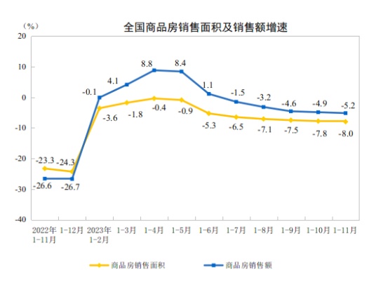 1—11月份,商品房销售面积100509万平方米,同比下降8.0%,其中住宅销售面积下降7.3%。商品房销售额105318亿元,下降5.2%,其中住宅销售额下降4.3%。