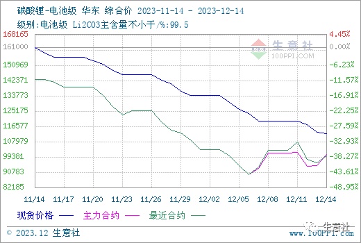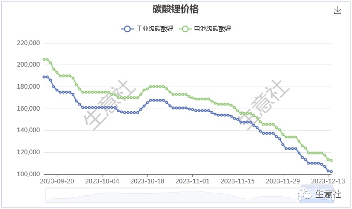 生意社商品行情分析系统显示,12月14日工业级碳酸锂国内混合均价为102400元/吨,较12月10日均价110000元/吨下降了6.91%;电池级碳酸锂国内混合均价为112600元/吨,较12月10日均价119400元/吨下降了5.7%。