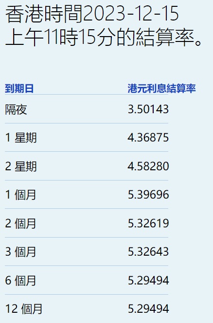 智通财经APP获悉,12月15日,港元拆息持续走软,与楼按相关的一个月拆息则连跌六天,今报5.39696%,创三周新低。不过,隔夜息中止五连跌,回升27基点至3.50143%。