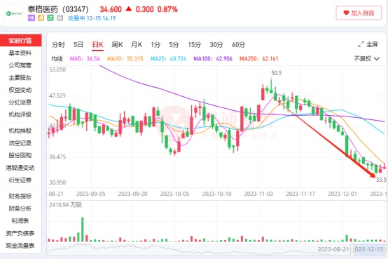 从二级市场表现来看,泰格医药虽然在10月底股价回升迅速,但在之后的11月初出现快速的股价反转,在11月8日盘中触顶50.5港元后,泰格医药股价持续快速下跌,并在12月11日盘中跌至33.5港元,触及公司上市以来的股价新低,并且若不考虑12月5日小幅收涨的情况,公司股价已经连续12个交易日收跌。