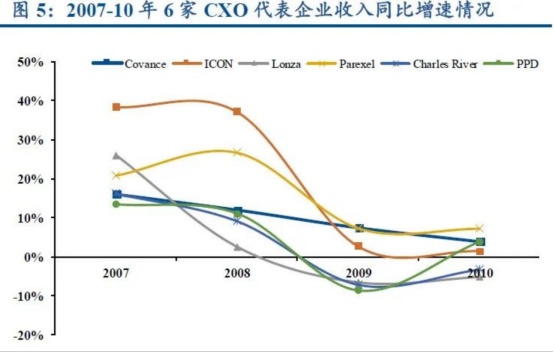 在财务数据背后,若将CRO企业2007-2009年报中各项细分业务进行了拆分,可以发现受到下游行业波动影响较大的主要是CXO企业的临床前业务。例如Covance临床前实验室服务收入同比增速从2008年的11%下滑到2009年的-9%,CharlesRiver临床前业务同比增速从2008年的4.7%下滑到2009年的-21%。