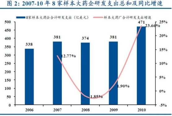 对应下游研发企业的数据,2007-2009年8大药企总体研发投入保持稳定,或为继续保持对临床后期等核心药品投入力度但缩减大量早期项目投入导致。