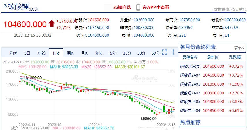 智通财经APP获悉,12月15日,碳酸锂期货价格维持涨势,主力合约一度大涨3%,价格处于10.5万关口附近。截至收盘,碳酸锂2407合约现价104600元/吨,涨幅3.72%;其余10份合约现价均在10万元/吨之上,涨幅在2%、3%左右。近7个交易日来,碳酸锂期货的价格走势有所抬头,但仍在10万元/吨关口处呈现震荡状态,多空势力不断拉锯。