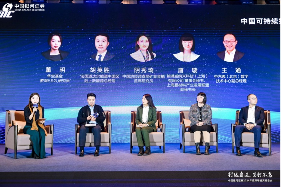 第一个圆桌主题是“企业转型:加速低碳投资与创新”,由华宝基金资深ESG研究员,董玥主持,法国道达尔能源中国区陆上新能源总经理胡英胜、中国地质调查局矿业金融首席研究员阴秀琦、纳琳威纳米科技(上海)有限公司董事会秘书、上海膜材料产业发展联盟副秘书长唐璇和中汽碳(北京)数字技术中心副总经理王通,从产业链的角度对能源行业、矿产行业、汽车行业及纳米材料就ESG及低碳转型进行了探讨。