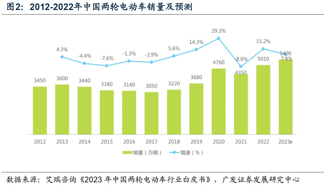 根据艾瑞咨询《2023年中国两轮电动车行业白皮书》数据,2022年中国电动两轮车销量约5010万辆,同比口径下增长了15%,2019-2022年销量CAGR达到11%。