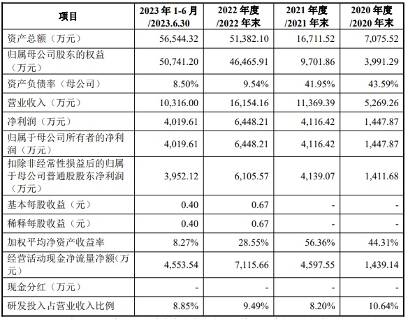 财务方面,于2020年、2021年、2022年、2023年1-6月,公司实现营业收入分别为0.53亿元、1.14亿元、1.62亿元、1.03亿元,同期,公司实现净利润分别为1447.87万元、4116.42万元、6448.21万元、4019.61万元。