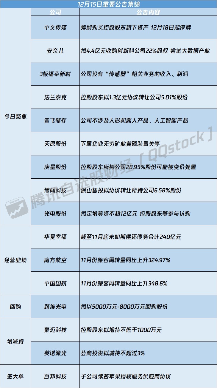 1、中文传媒:筹划购买控股股东旗下资产 12月18日起停牌