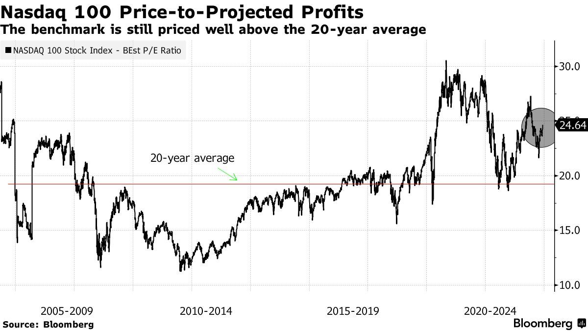 这些科技巨头更大规模的利润增速使得美股科技股的整体预期市盈率从此前的高不可攀的水平迅速下降,但它们的估值仍然非常高。机构汇编的数据显示,纳斯达克100指数未来12个月的预期市盈率约为25x。虽然这比2020年曾经触及的30x历史峰值有所下降,但远高于过去20年间19x的平均估值水平。