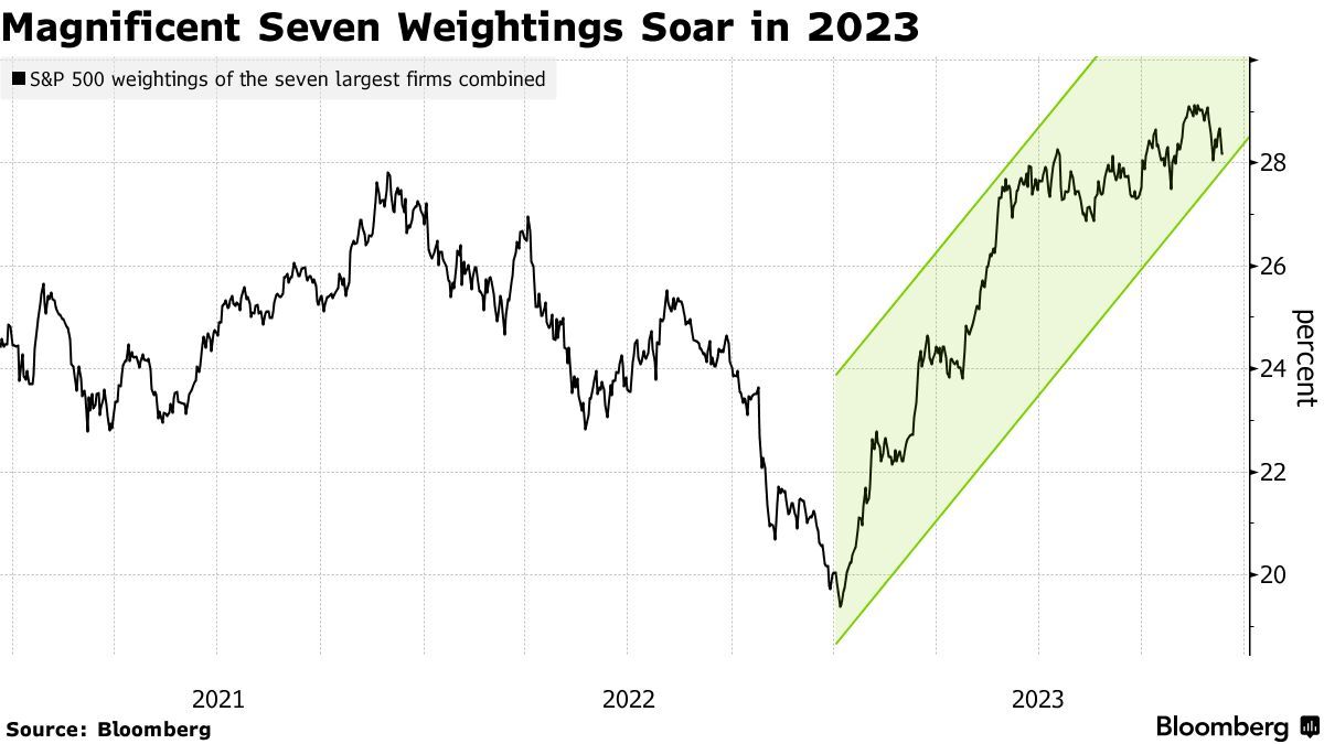 苹果(AAPL.US)、微软(MSFT.US)、谷歌母公司Alphabet(GOOGL.US)、亚马逊(AMZN.US)、英伟达(NVDA.US)、Meta(META.US)和特斯拉(TSLA.US)这7只最大市值规模的科技和互联网相关股票11月份在标普500指数中的总权重达到创纪录的29%。投资者今年蜂拥而至七大科技巨头,部分原因是他们纷纷押注,由于科技巨头们的庞大市场规模和财务实力,它们处于利用人工智能技术扩展营收的最佳位置。该指数在2023年高达23%的涨幅中,这一群体约占三分之二。