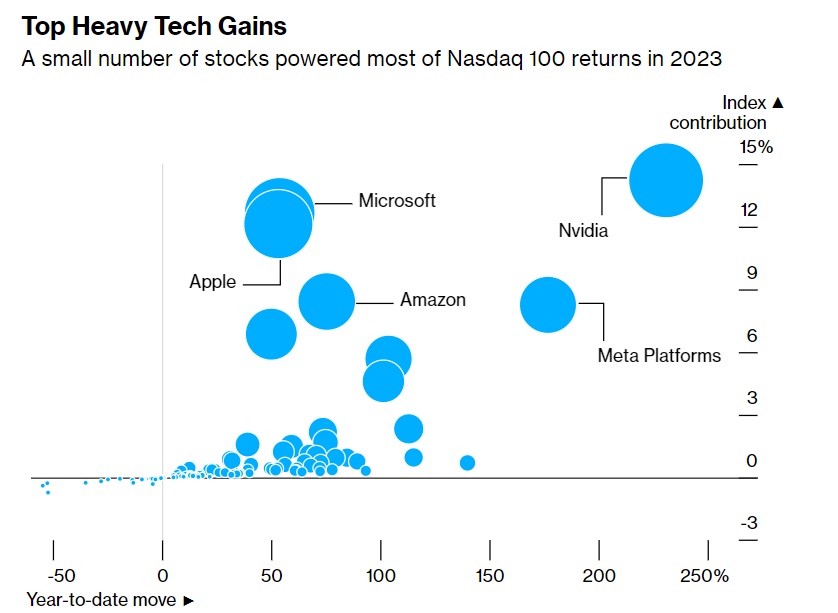 顶级科技股涨幅最大——2023年,少数股票推动了纳斯达克100指数的大部分回报率