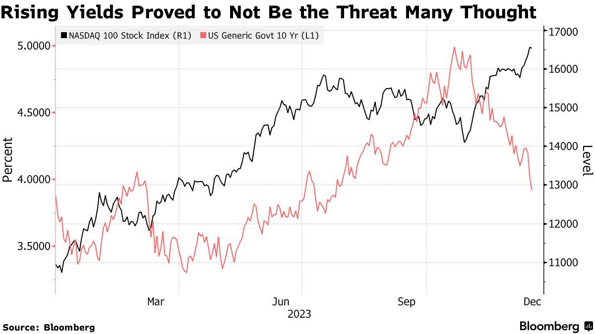 事实证明,今年大部分时间里美国基准利率的稳步提升趋势并没有像许多人去年所想象的那样对科技行业估值构成巨大威胁。相反,纳斯达克100指数继续上涨,尽管10年期美国国债收益率在今年大部分时间里保持在4%以上。在企业裁员数万人规模并控制支出后,利润上升推动了多数科技股走高。