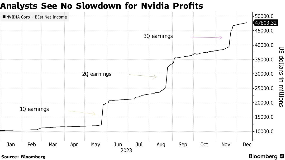 尽管关于英伟达的股价太贵还是刚刚合适仍存在极大争议,但有一件事是肯定的:华尔街分析师们普遍认为,推动英伟达股价上涨的前所未有的利润飙升趋势短中期内不会结束;预计该科技巨头未来12个月有望实现约480亿美元的利润,高于年初仅仅约100亿美元的预期。