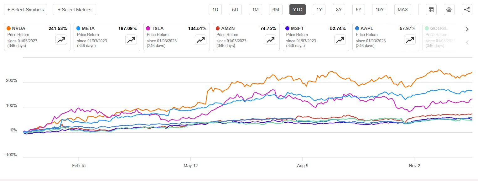 英伟达(NVDA.US)在2023年堪称是全球股票市场最火热的投资标的,得益于去年ChatGPT横空出世引发的人工智能投资狂潮,英伟达股价在2023年的表现异常出色。今年以来,英伟达股价涨幅达到了惊人的240%。这一成就不仅令该股轻松超过美股基准指数——标普500指数(S&P 500),同时年内涨幅位列七大科技巨头之首。美股市场的七大科技巨头(Magnificent Seven)包括:苹果、微软、谷歌、特斯拉、英伟达、亚马逊以及Meta Platforms。