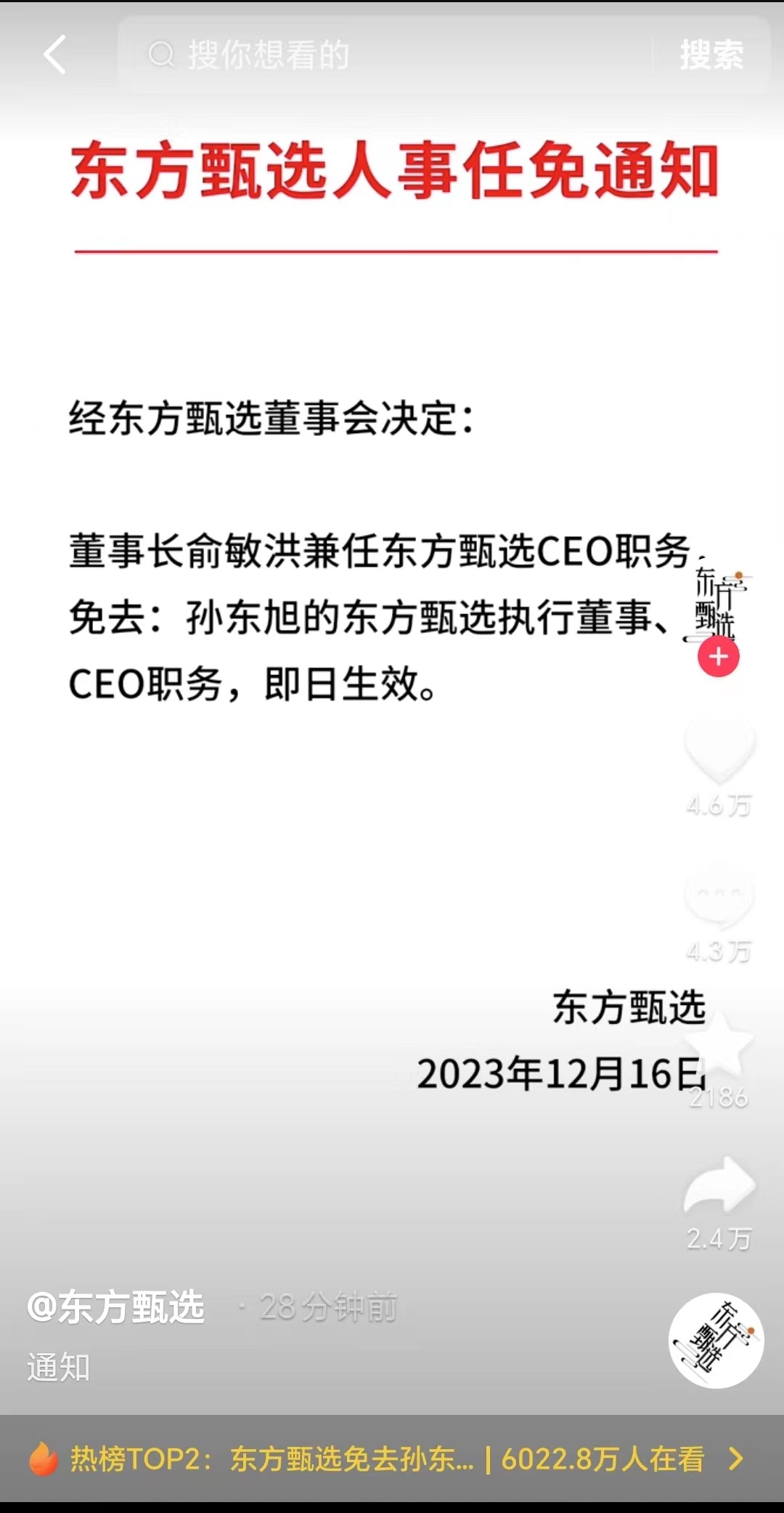 智通财经APP获悉,东方甄选(01797)抖音直播间发布消息,“经东方甄选董事会决定:董事长俞敏洪兼任东方甄选CEO职务,免去:孙东旭的东方甄选执行董事、CEO职务,即日生效。”