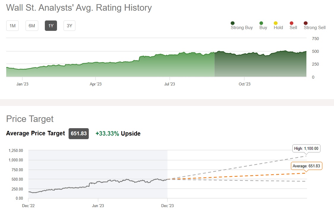 华尔街股票评级和股价预期方面,投资研究平台Seeking Alpha汇编的预期数据显示,华尔街分析师们予以英伟达的共识评级为“买入”,平均目标价达651.83美元这一历史新高,意味着未来12个月潜在上行空间达33%,最高目标价则高达1100美元。