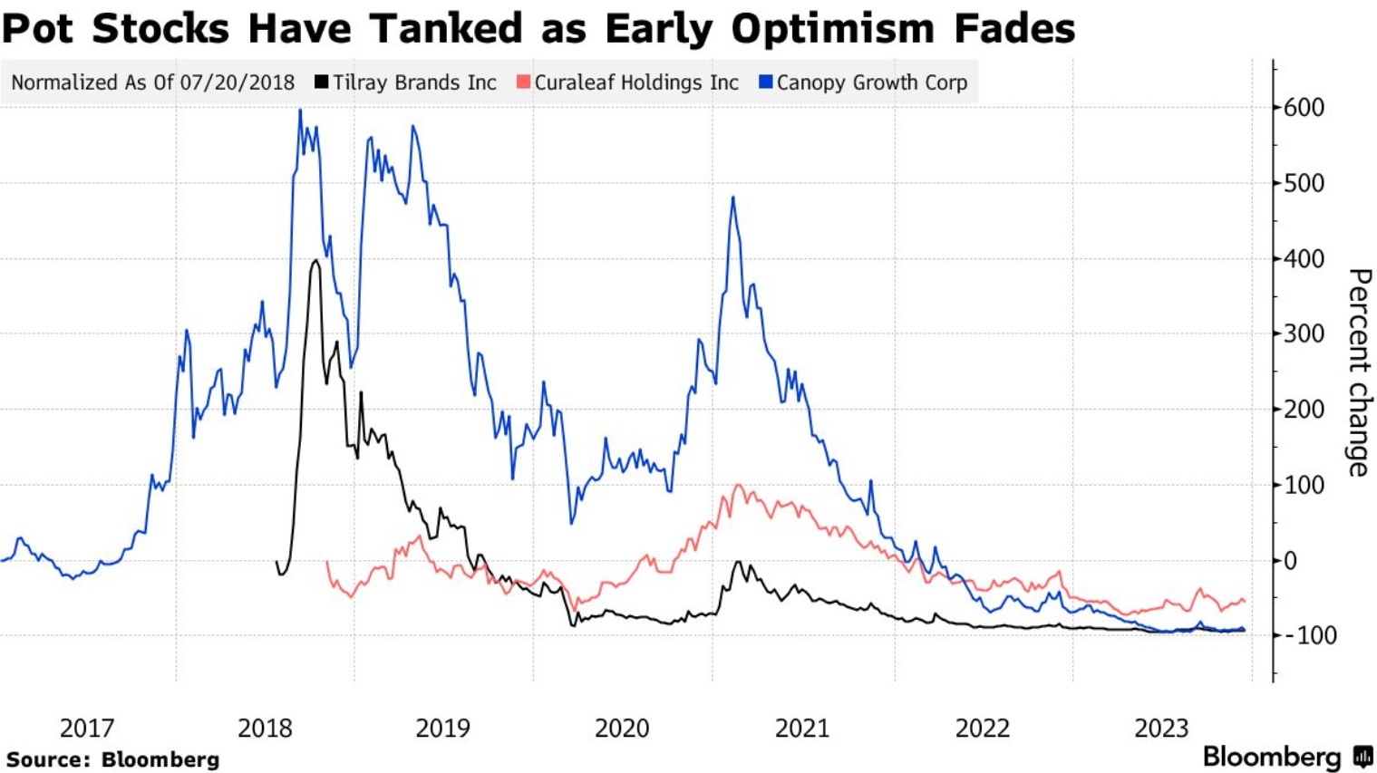 多年来,大麻类股票的价格高低一目了然:Tilray Brands(TLRY.US)的美国股票价格仅约2美元,仅是2018年股价高峰约214美元时的一小部分。Curaleaf Holdings Inc.(CURLF.US)自2021年高峰以来损失了大约100亿美元的股东价值。本周,Canopy Growth(CGC.US)不得不采取10比1的反向拆股计划,以确保股价每股1美元以上。