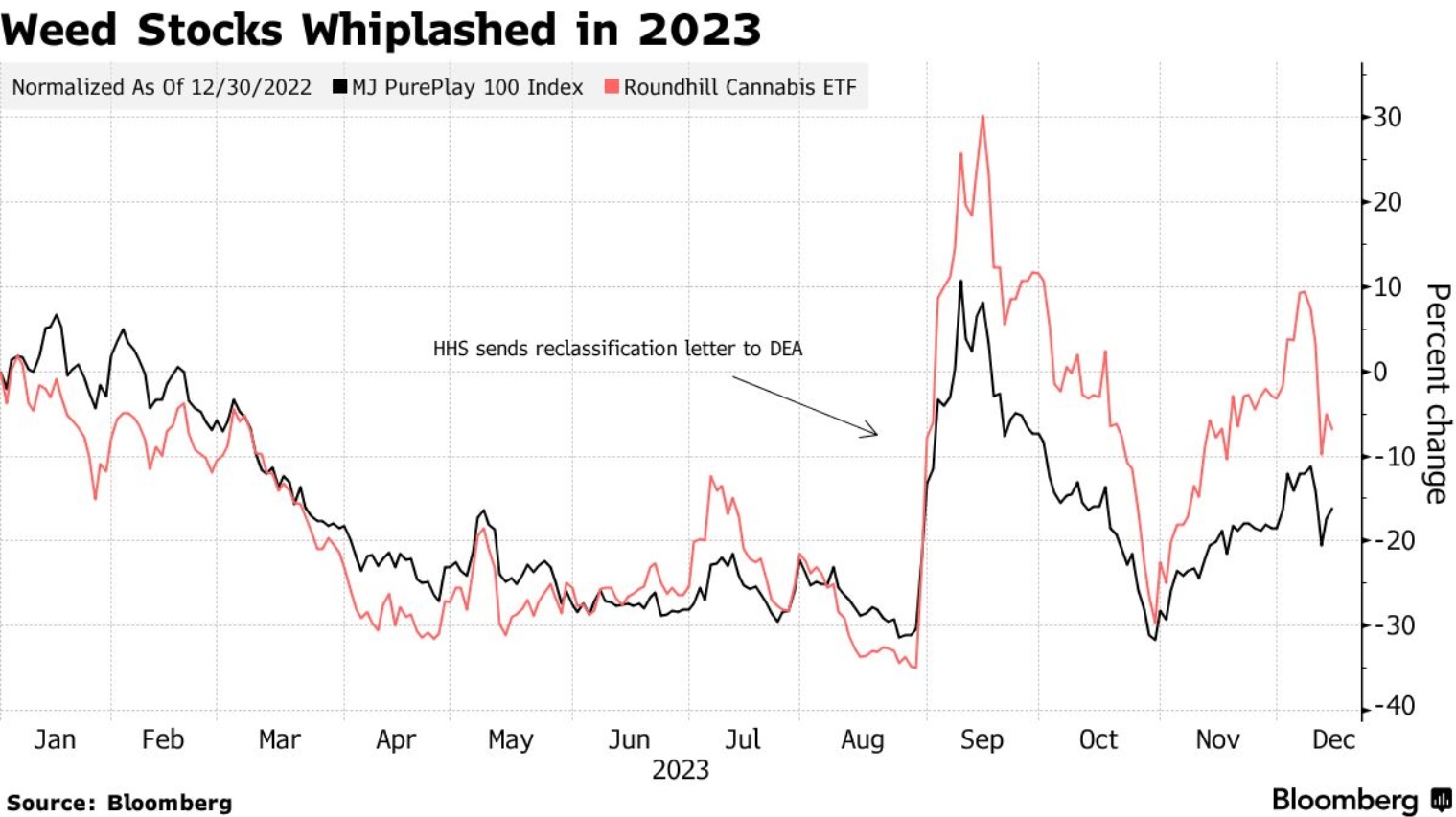 Roundhill Financial Inc.的首席执行官兼联合创始人威尔·赫尔希认为这是一种失望。去年,他推出了一只追踪美国大麻公司的交易所交易基金(代码WEED),当时的预期是2023年对大麻股票来说将是更好的一年。