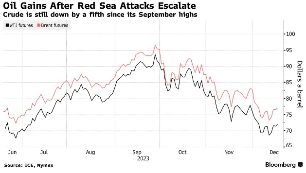 全球基准布伦特原油继上周上涨0.9%之后升至每桶77美元上方,结束了连续七周的下跌。WTI原油价格接近72美元。在美国表示击落了伊朗支持的胡塞武装控制下发射的 14 架无人机后,埃及苏伊士运河管理局表示“密切关注”红海紧张局势也门地区。