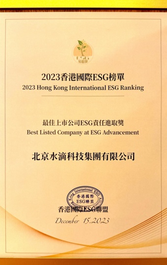 12月15日,由香港大公文汇传媒集团主办,香港中国企业协会、香港中国金融协会、香港中资证券业协会、香港公司治理公会联合举办的“2023第十三届香港国际金融论坛”在香港举行,香港政商界人士、内地及香港上市公司代表、创投机构负责人和经济学家等超过300人出席论坛。本届论坛首次发布了2023香港国际ESG榜单,这项年度评选活动,旨在表彰在ESG领域取得杰出成就的企业和机构。经过严格的评审程序,水滴公司凭借在ESG领域的工作与成果,荣获“最佳上市公司ESG责任进取奖”,并受邀出席领奖。