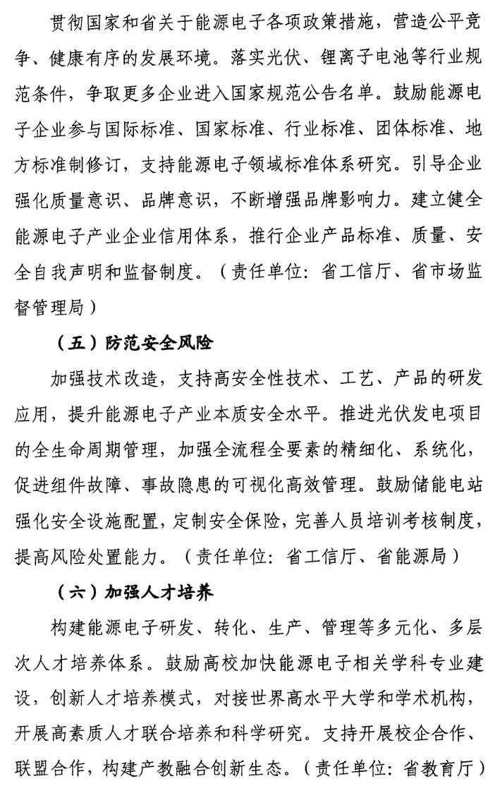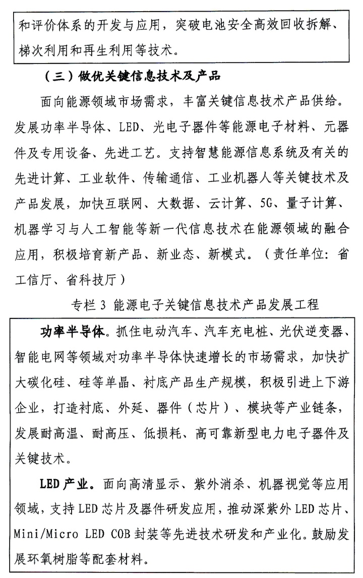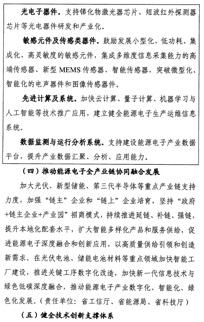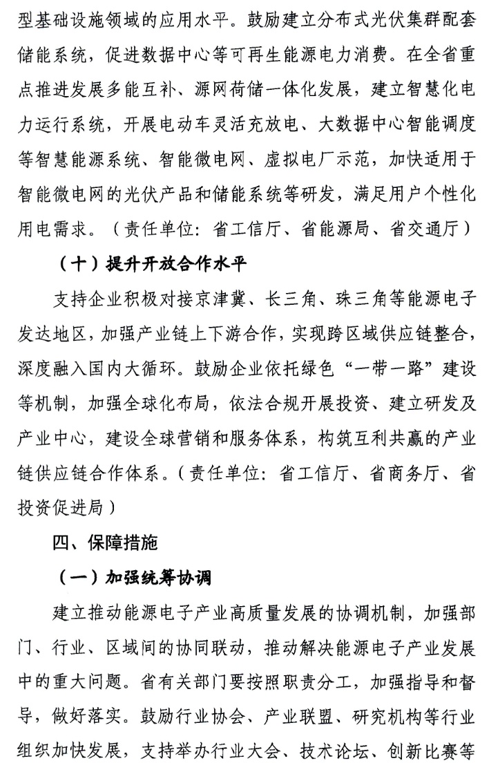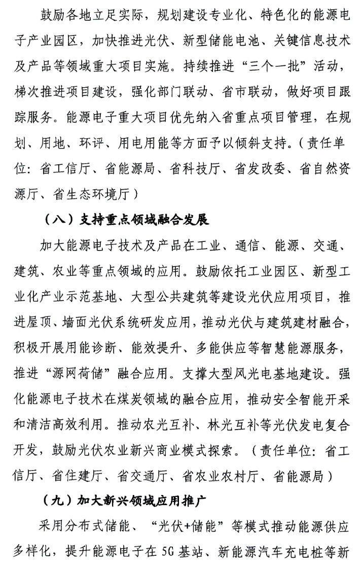 此外,采用分布式储能、“光伏+储能”等模式推动能源供应多样化,提升能源电子产品在5G基站、新能源汽车充电桩等新型基础设施领域的应用水平。鼓励建立分布式光伏集群配套储能系统,促进数据中心等可再生能源电力消费。在全省重点推进发展多能互补、源网荷储一体化发展,建立智慧化电力运行系统,开展电动车灵活充放电、大数据中心智能调度等智慧能源系统、智能微电网、虚拟电厂示范,加快适用于智能微电网的光伏产品和储能系统等研发,满足用户个性化用电需求。