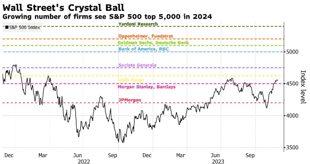 高盛与美国银行和奥本海默等华尔街同行一样,预计该指数将在2024年创下新高。高盛策略师们表示:“股市已经反映出积极的经济活动,但现在反映出更为强劲的前景。”