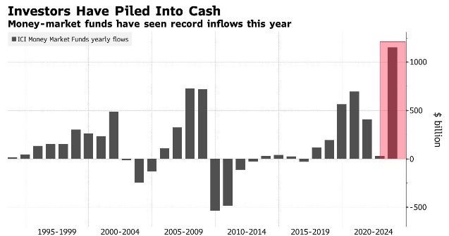 但Kostin指出,尽管股市大涨,但仍有大量资金未进入股市。随着利率攀升,今年有1.4万亿美元资金流入货币市场基金,远高于流入美国股市的950亿美元。他说:“随着利率开始下降,投资者可能会将部分现金转投股市。”